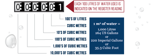 Your new water meter accurately measures the water you use in litres and cubic metres (m3). Your water bill is calculated based on the number of cubic metres used in a billing cycle. As water passes through the meter, the “Sweep Hand” moves around the dial. Each complete revolution of the dial equals 100 litres (.1m3) of water.